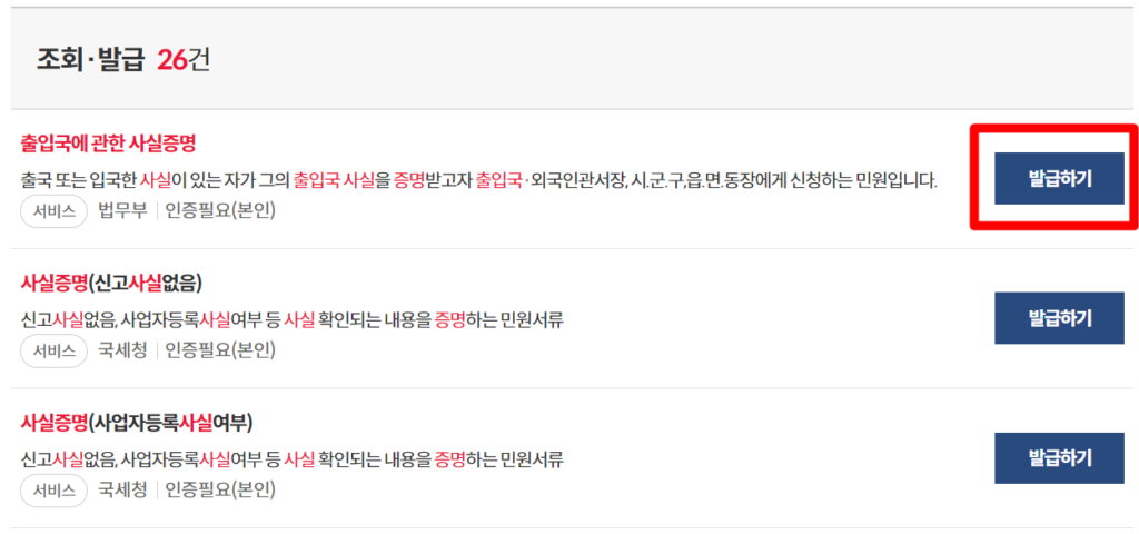 - 검색창에 ‘출입국에 관한 사실증명’ 검색하고 발급하기 클릭